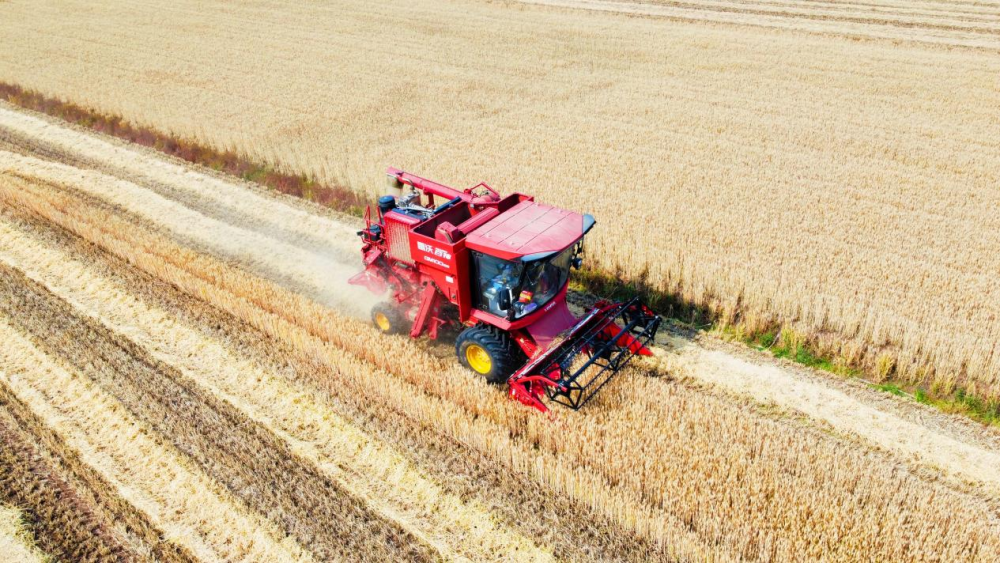 圖為5月27日,農(nóng)機(jī)手駕駛大型機(jī)械在山東臨沂市郯城縣泉源鎮(zhèn)大馬莊村的麥田里收割成熟的麥子。(李學(xué)飛 攝)