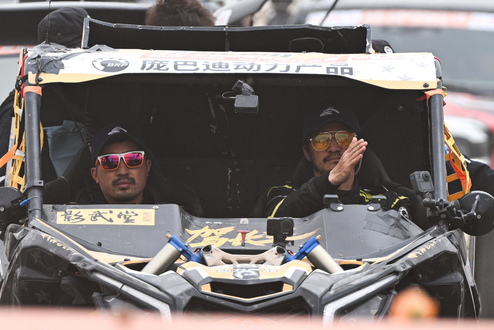 ↑6月1日,駕長車隊車手吳京(右)、領(lǐng)航員梁冬冬在賽后參加收車儀式。新華社記者 辛悅衛(wèi) 攝