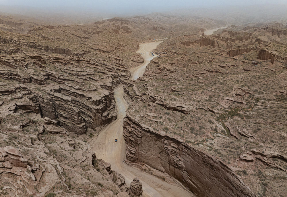 ↑5月26日,一輛摩托車行駛在第五賽段賽道上(無人機照片)