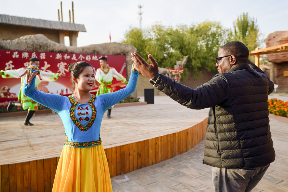 ↑2024年10月15日,第六屆世界媒體峰會與會嘉賓在阿克蘇地區(qū)新和縣加依村龜茲文化樂器展示中心與演員互動。新華社記者 陳朔 攝