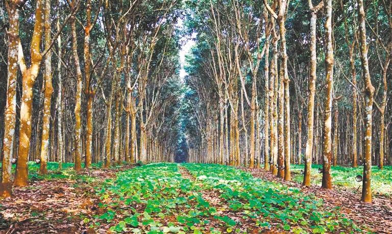 在距離西雙版納傣族自治州景洪市環(huán)城北路約1公里處,記者見(jiàn)到云南省熱帶作物科學(xué)研究所占地1054畝的環(huán)境友好型生態(tài)膠園千畝試驗(yàn)示范基地。這里將橡膠樹(shù)種植行距從傳統(tǒng)8米擴(kuò)大到20米以上,在橡膠樹(shù)間套種上述經(jīng)濟(jì)作物。如此布局,即使橡膠行情不好,經(jīng)過(guò)精心篩選套種的其他經(jīng)濟(jì)作物也能取得不錯(cuò)的經(jīng)濟(jì)效益。