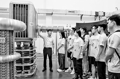 中國原子能科學研究院研究員在瑞昌核物理應用研究院向?qū)W生們講解我國自主研發(fā)的AMS加速器。魏東升攝/光明圖片
