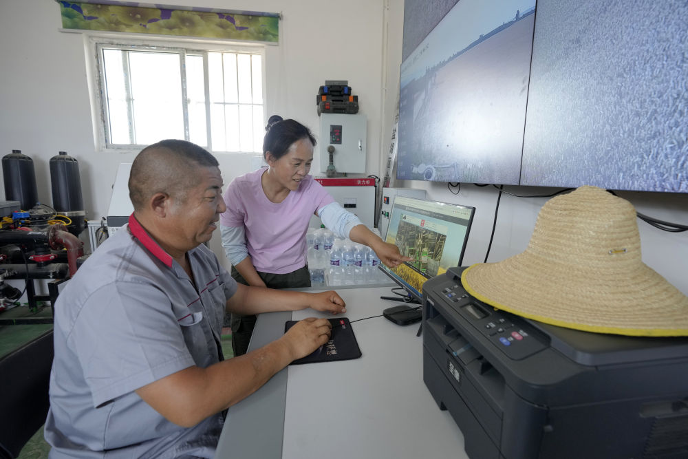 在山西省運(yùn)城市鹽湖區(qū)解州鎮(zhèn)曲村,董會(huì)龍(左)和妻子范月親通過農(nóng)機(jī)精準(zhǔn)作業(yè)平臺(tái)查看農(nóng)機(jī)手作業(yè)情況。董會(huì)龍夫妻是運(yùn)城市鹽湖區(qū)解州鎮(zhèn)的種糧大戶。(5月27日攝)。