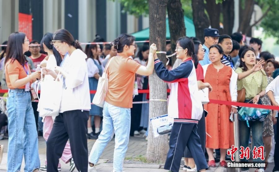 資料圖:2024年6月7日,湖北省武漢市長虹中學考點,考生入場前與送考老師擊掌。張暢 攝