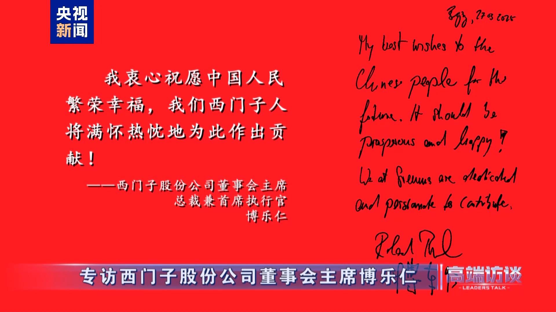 西門子股份公司董事會主席總裁兼首席執(zhí)行官博樂仁在接受總臺專訪后題詞