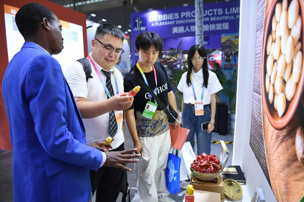 6月12日,在長(zhǎng)沙國(guó)際會(huì)展中心,參展商推介盧旺達(dá)辣椒產(chǎn)品。當(dāng)日,第四屆中國(guó)-非洲經(jīng)貿(mào)博覽會(huì)在長(zhǎng)沙舉行。(圖片來(lái)源:新華社)
