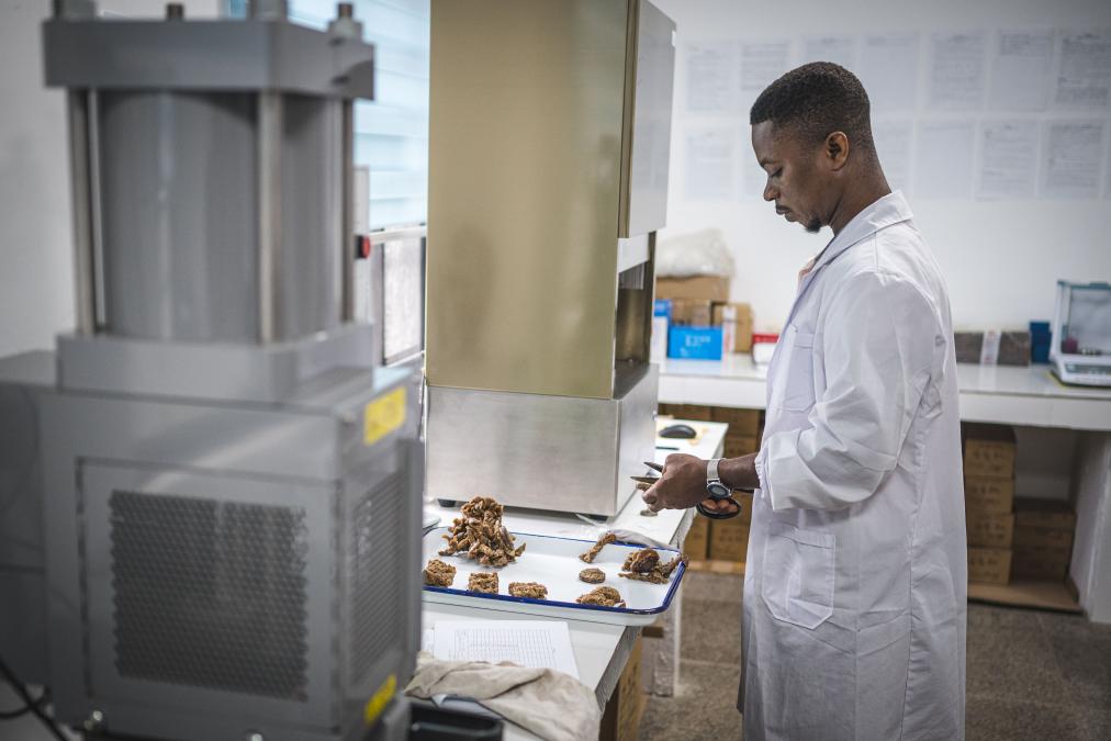 5月30日,在科特迪瓦圣佩德羅省大貝雷比鎮(zhèn),美蘭集團(tuán)橡膠加工廠的技術(shù)人員對(duì)橡膠進(jìn)行質(zhì)量測(cè)試。新華社記者王冠森攝