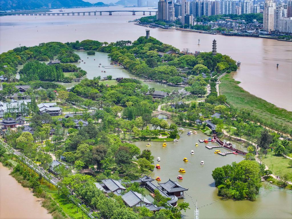 浙江省溫州市鹿城區(qū)江心嶼景區(qū)(無(wú)人機(jī)照片,2025年5月1日攝)。新華社發(fā)(蘇巧將攝)