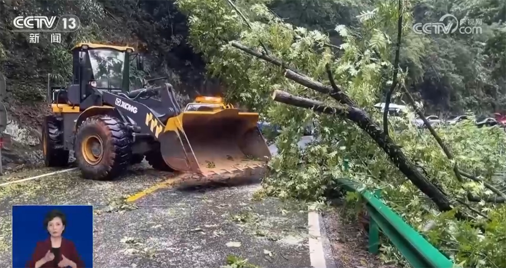在邊坡垮塌現(xiàn)場,大量泥石和樹木橫倒在道路中間,當(dāng)?shù)毓窊岆U人員迅速對此處路段實施交通管制,并利用機(jī)械開展清障工作。
