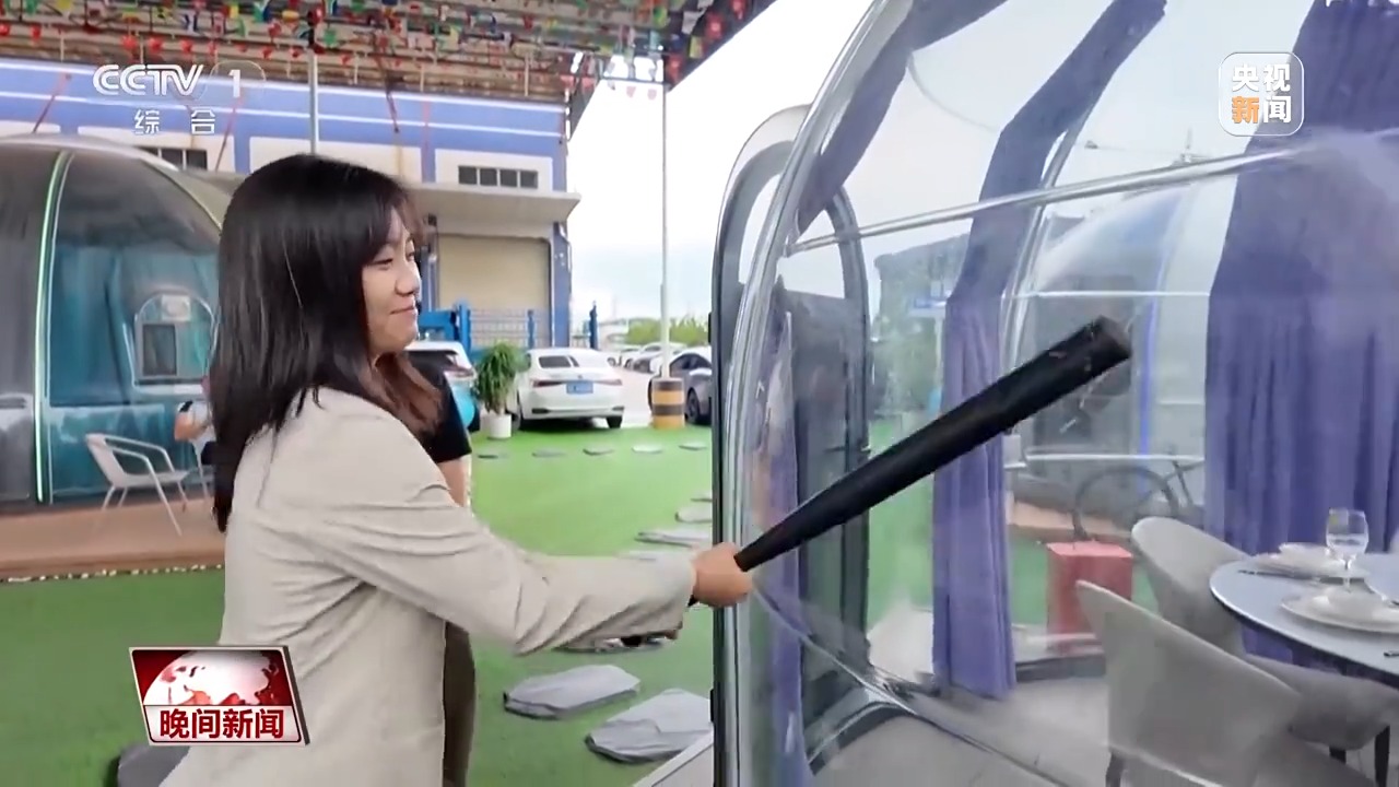 “星空房”的墻面材質(zhì)只有4毫米厚。為了驗證房屋強度,企業(yè)負(fù)責(zé)人請記者現(xiàn)場用鐵棒猛擊外墻。幾輪擊打過后,墻面毫發(fā)無傷,沒有出現(xiàn)任何裂痕。