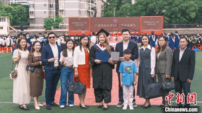 在廣西科技大學(xué)27日舉行的畢業(yè)典禮上,老撾留學(xué)生馬麗文成為全場(chǎng)焦點(diǎn):她的父母、兄弟等十位親人跨國(guó)而來(lái),見(jiàn)證這一重要時(shí)刻?!爱?dāng)家人手捧鮮花向我走來(lái),我緊緊擁抱住他們,感謝他們支持我的夢(mèng)想?!瘪R麗文說(shuō)。