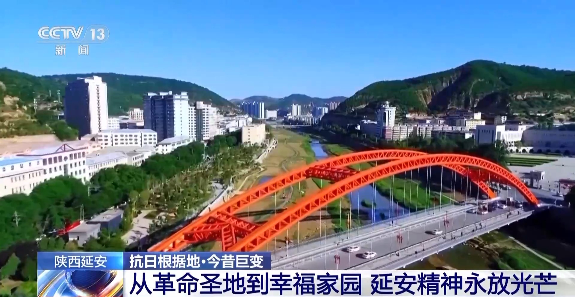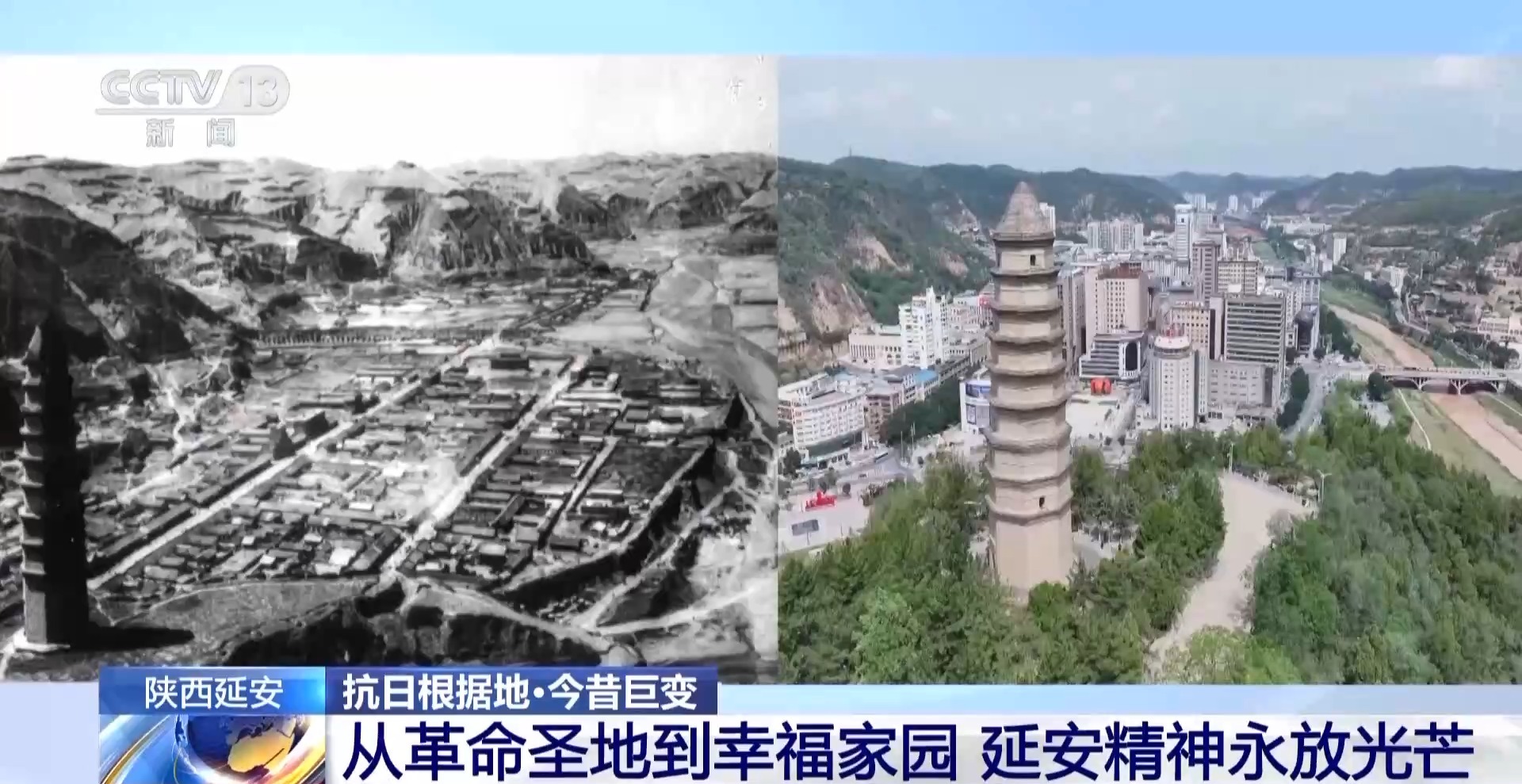 說到延安,很多人自然就會想到巍巍寶塔山,這張照片就是拍攝于80多年前的寶塔山上。當時,城里大多是低矮的平房。如今從同一個位置俯瞰,這里已經(jīng)發(fā)生了翻天覆地的巨變——延河兩岸,高樓大廈拔地而起,鱗次櫛比的現(xiàn)代化新城矗立眼前。