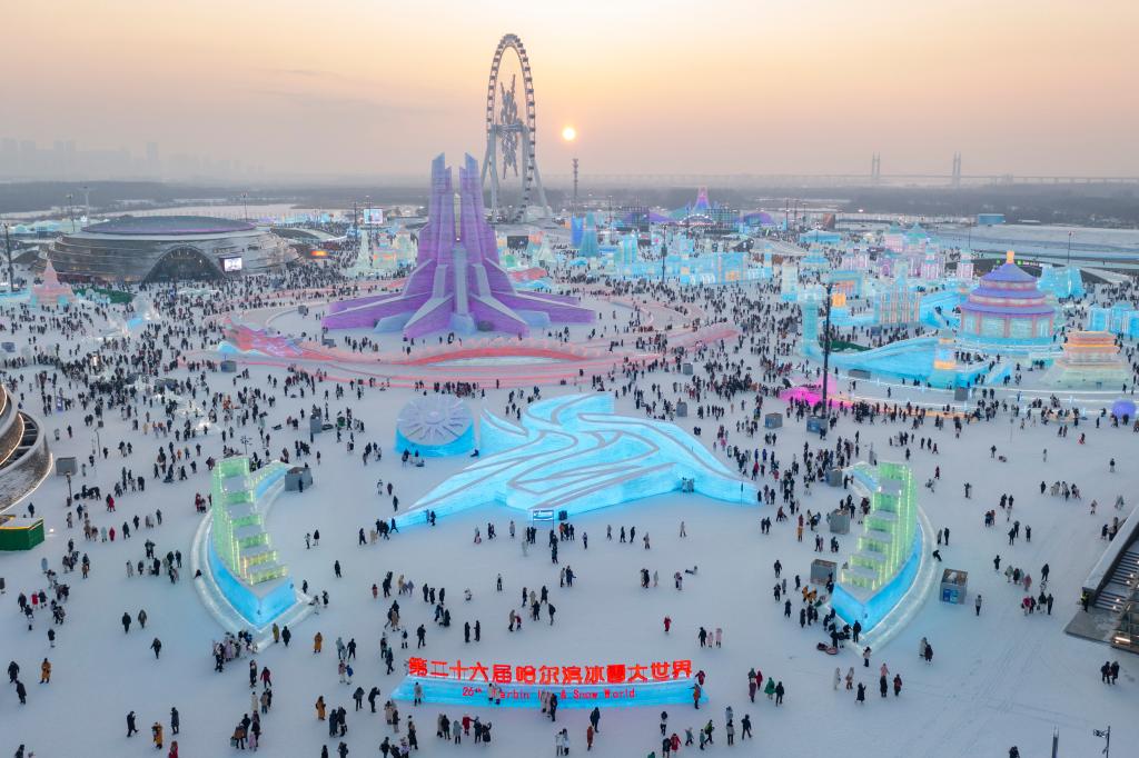 游客在哈爾濱冰雪大世界園區(qū)內游玩(無人機照片)。新華社記者謝劍飛 攝