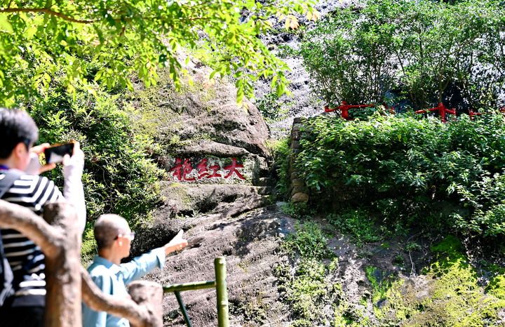 6月25日,游客在福建武夷山風(fēng)景名勝區(qū)參觀生長在武夷山九龍窠高巖峭壁上的大紅袍茶樹母株。