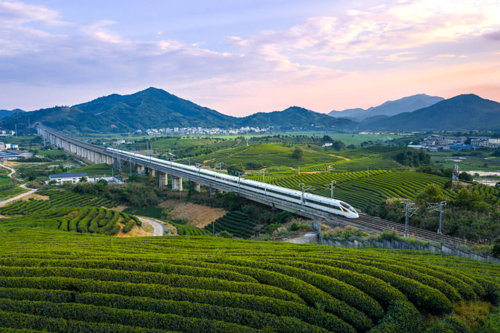 6月6日,復(fù)興號動(dòng)車組經(jīng)過福建武夷山境內(nèi)的合福高鐵南岸特大橋。(該圖片由中國鐵路南昌局集團(tuán)有限公司提供)