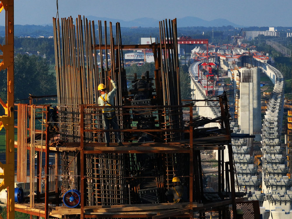 7月3日,中鐵上海工程局的工人在寧淮城際鐵路(南京至淮安)5標(biāo)項目跨滁河斜拉橋施工作業(yè)(無人機照片)。(新華社記者 李博 攝)