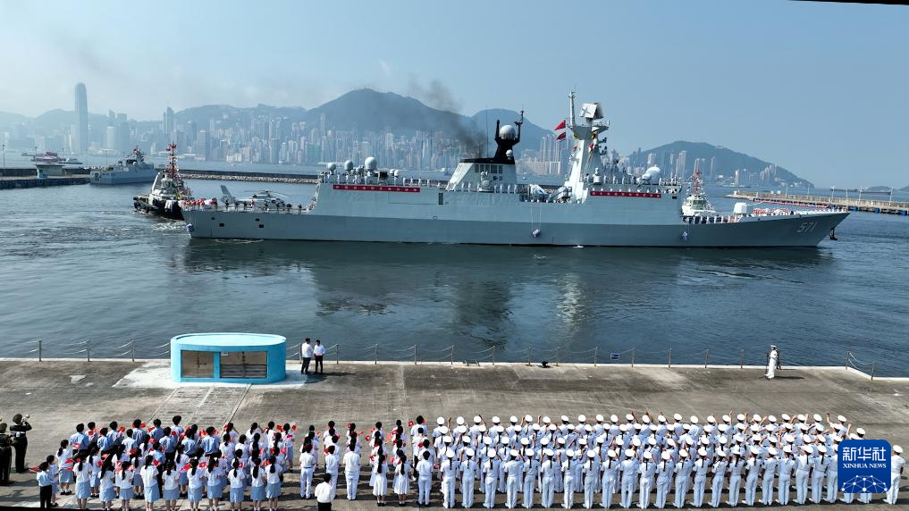 7月7日,湛江艦駛離昂船洲軍營碼頭,士兵分區(qū)列隊向前來送行的人群揮手告別。新華社發(fā)(馮麗 攝)