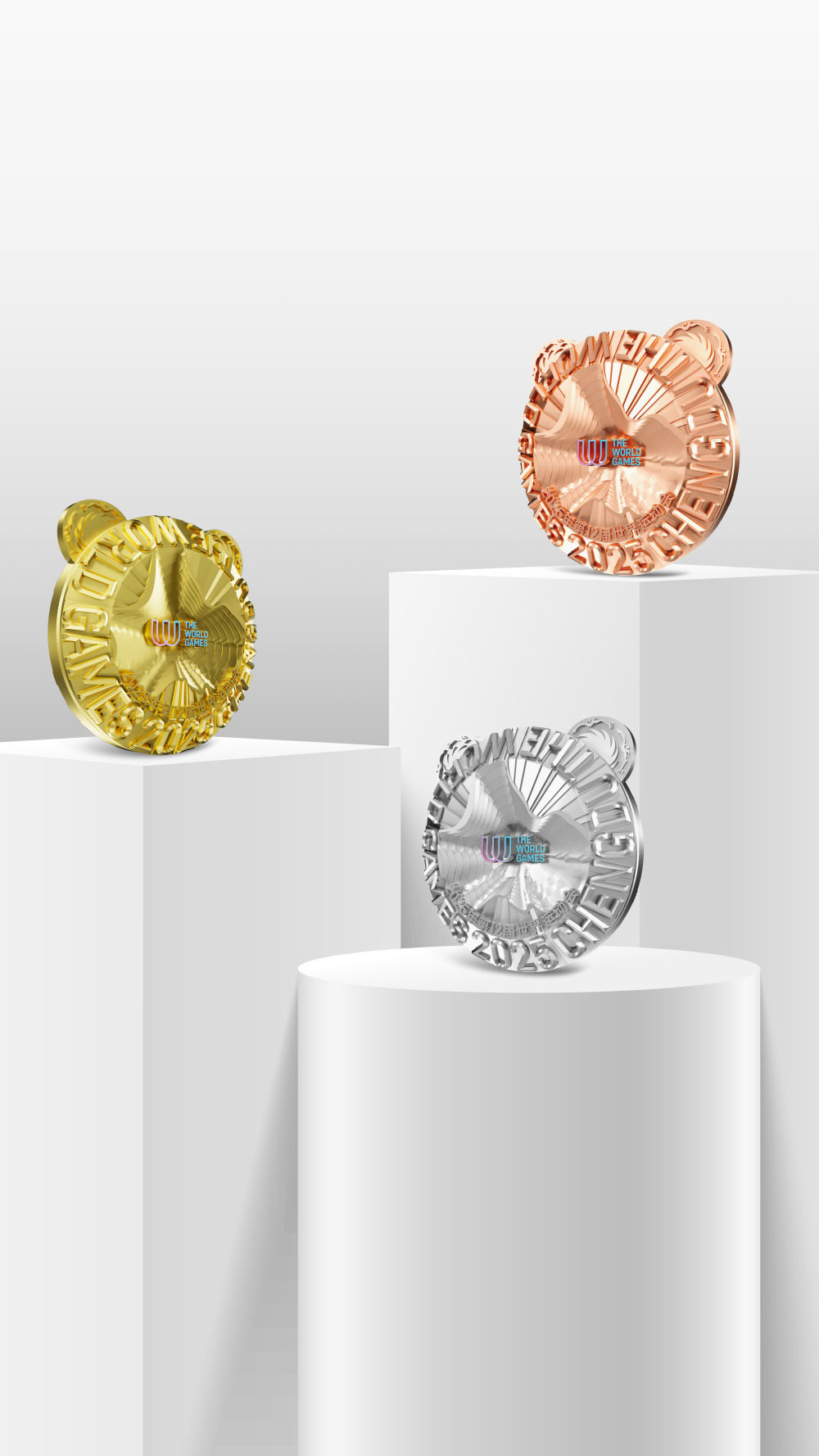 這是成都世運(yùn)會金、銀、銅牌效果圖。6月19日,2025年第12屆世界運(yùn)動會獎牌“竹光”正式亮相。新華社發(fā)(成都世運(yùn)會執(zhí)委會供圖)