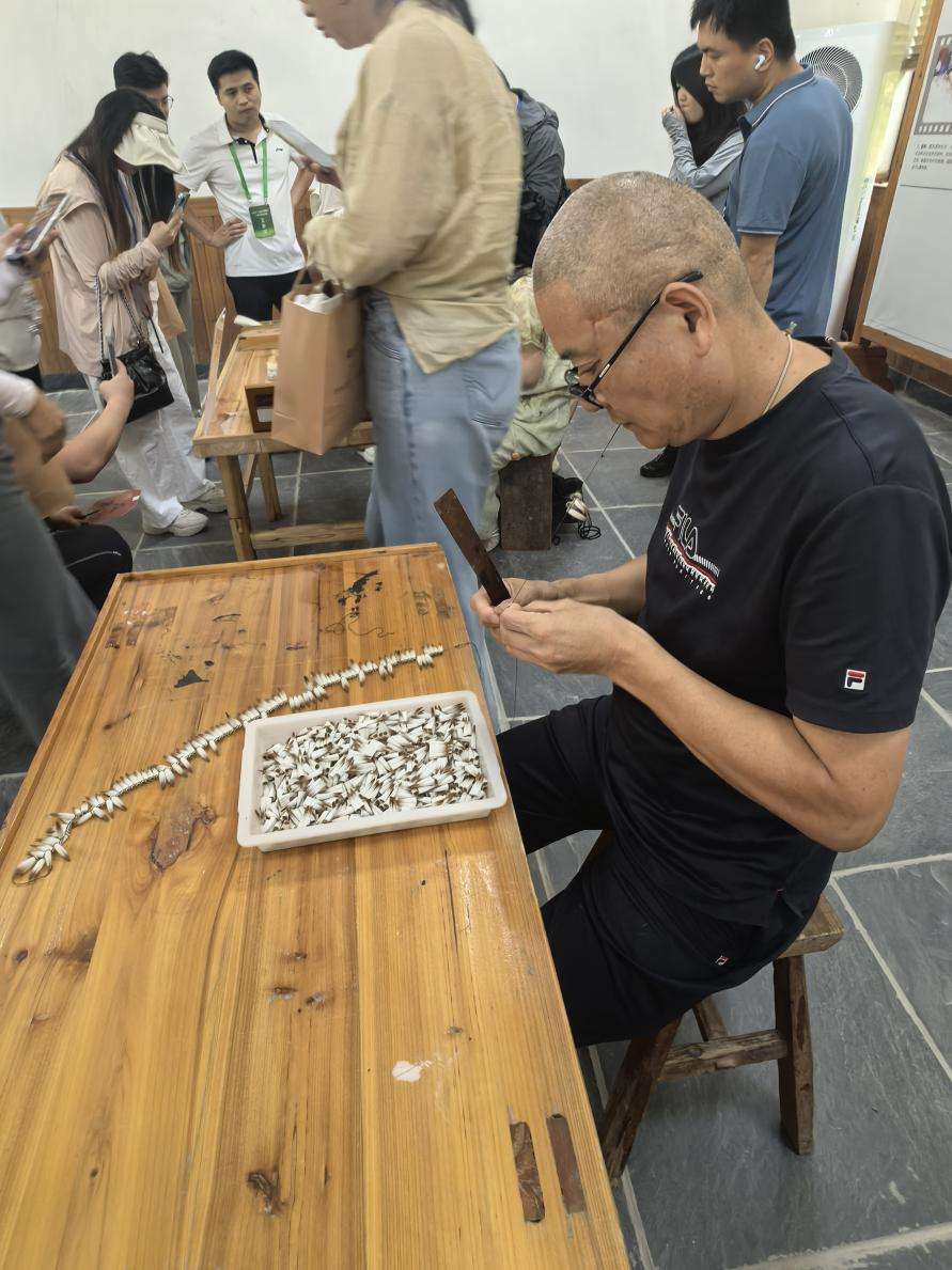 在博物館的體驗(yàn)區(qū)域,幾位制筆匠人正現(xiàn)場演示毛筆制作的各工藝環(huán)節(jié)。市級(jí)非物質(zhì)文化遺產(chǎn)項(xiàng)目代表性傳承人周平正咬著線的一端,兩手飛快地纏綁筆頭,這是制筆過程的“綁筆”環(huán)節(jié)。周平的徒弟李啟富在一旁認(rèn)真觀看,將師父的每一個(gè)動(dòng)作記在心里。
