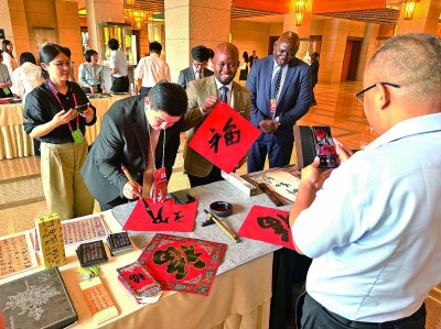 與會外國嘉賓在會議間隙體驗寫福字。光明日報記者 楊逸夫攝/光明圖片