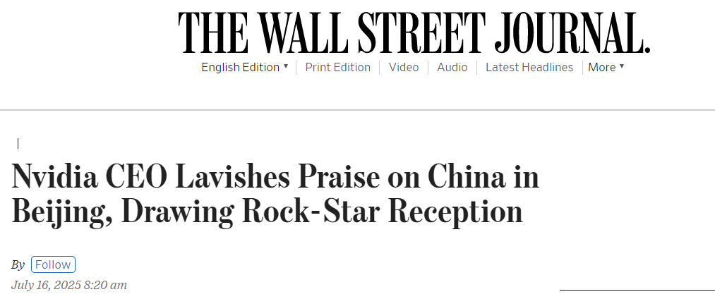 美國《華爾街日報》報道稱,市值達(dá)4萬億美元的AI芯片公司掌門人黃仁勛在訪問北京期間多次表達(dá)對中國的贊賞,盛贊中國的科技進(jìn)步。