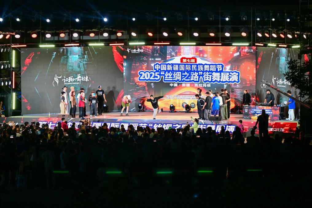 8月3日晚,在第七屆中國(guó)新疆國(guó)際民族舞蹈節(jié)2025“絲綢之路”街舞展演的舞臺(tái)上,國(guó)內(nèi)外舞者相聚克拉瑪依市同臺(tái)亮相,用街舞語言講述追夢(mèng)的青春故事。