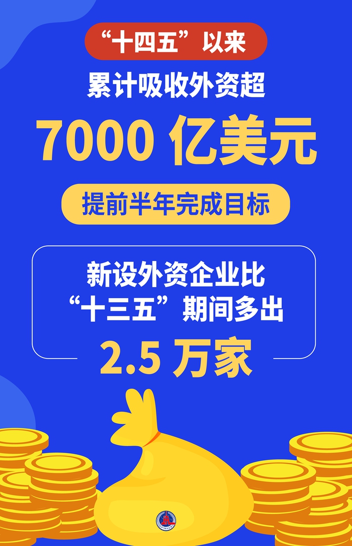復雜嚴峻的國際經貿環(huán)境下,我國吸引外資交出亮眼答卷——“十四五”以來,累計吸收外資超7000億美元,提前半年完成目標,新設外資企業(yè)比“十三五”期間多出2.5萬家。