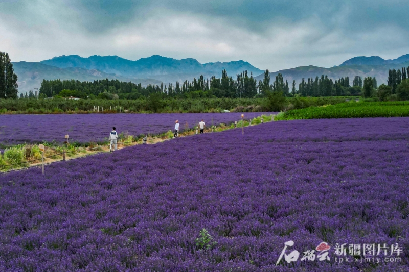 6月20日,游客在霍城縣蘆草溝鎮(zhèn)四宮村薰衣草花田里參觀游覽。(資料圖)