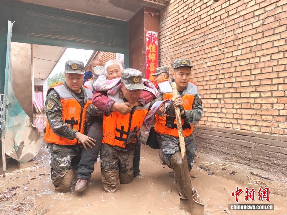 8月8日,武警甘肅總隊機(jī)動支隊官兵在甘肅省蘭州市榆中縣興隆山村轉(zhuǎn)移被困群眾。劉昆 攝