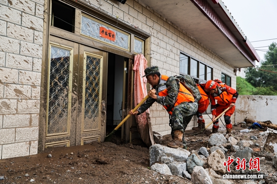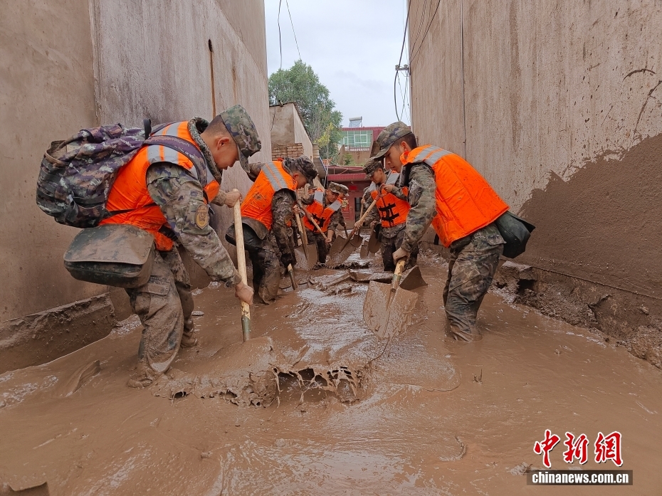 8月8日,武警甘肅總隊機(jī)動支隊官兵在甘肅省蘭州市榆中縣興隆山村清理淤泥。劉昆 攝
