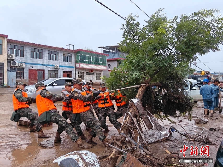 8月8日,武警甘肅總隊機(jī)動支隊官兵在甘肅省蘭州市榆中縣興隆山村挪移損毀樹木。劉昆 攝