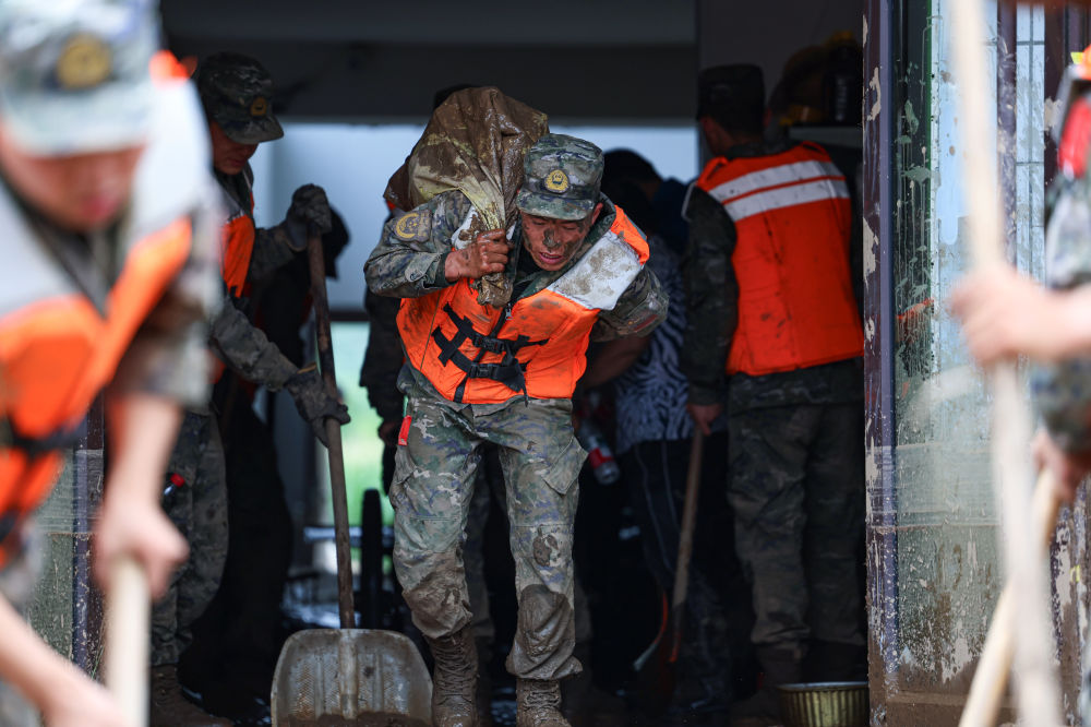 記者8日在救援現(xiàn)場看到,救援人員兩人一組用繩子將彼此連接,背著鐵鍬蹚過泥水。他們背起受災(zāi)群眾,將其轉(zhuǎn)移至安全地帶,有的推車清理淤泥,為后續(xù)救援開辟道路。