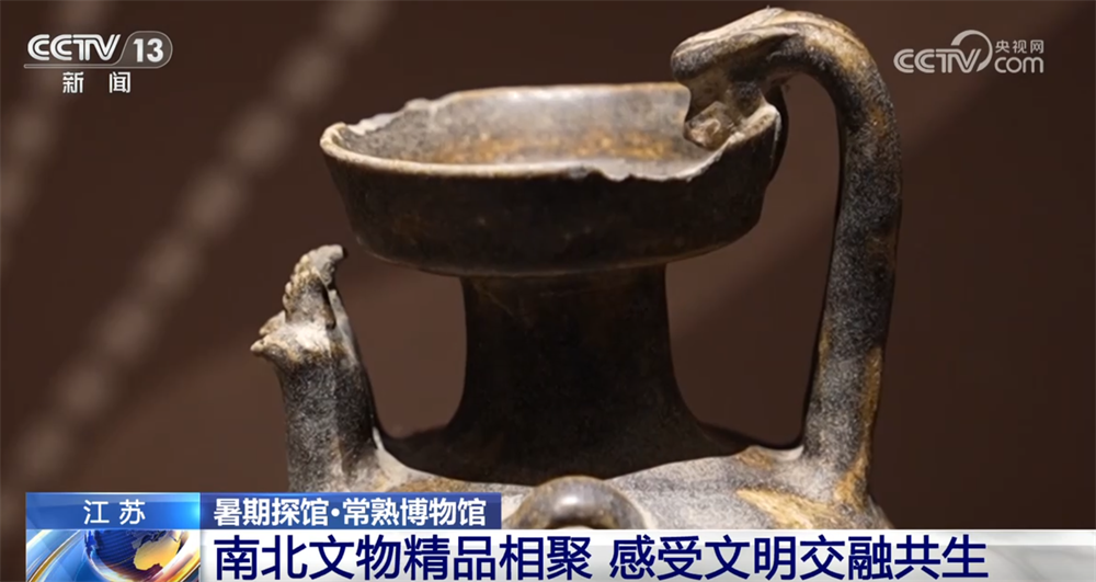 再來(lái)看這一件展品,這是東晉時(shí)期浙江德清出土的雞首壺,一側(cè)是有一個(gè)雞頭模樣的造型,一個(gè)巴掌大小,矮胖矮胖的。再到這邊來(lái)看,同樣是雞首壺,從南方地區(qū)傳到北方去之后,它的造型也發(fā)生了一些變化,比如說(shuō)它的個(gè)頭變得更加瘦高瘦高的,而且它的執(zhí)柄也明顯變得更加修長(zhǎng),它也融入了一些異域的比如說(shuō)波斯文化的元素。