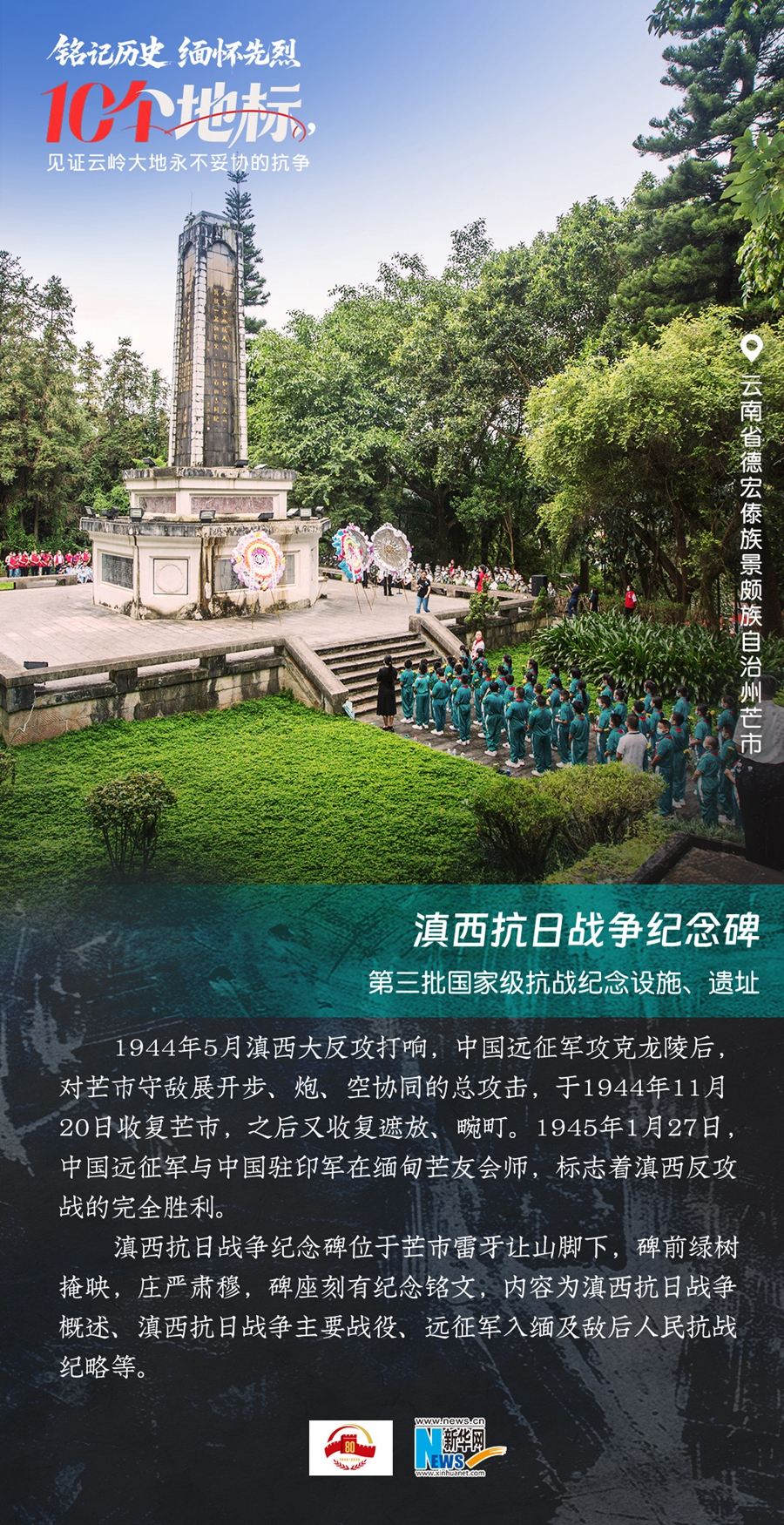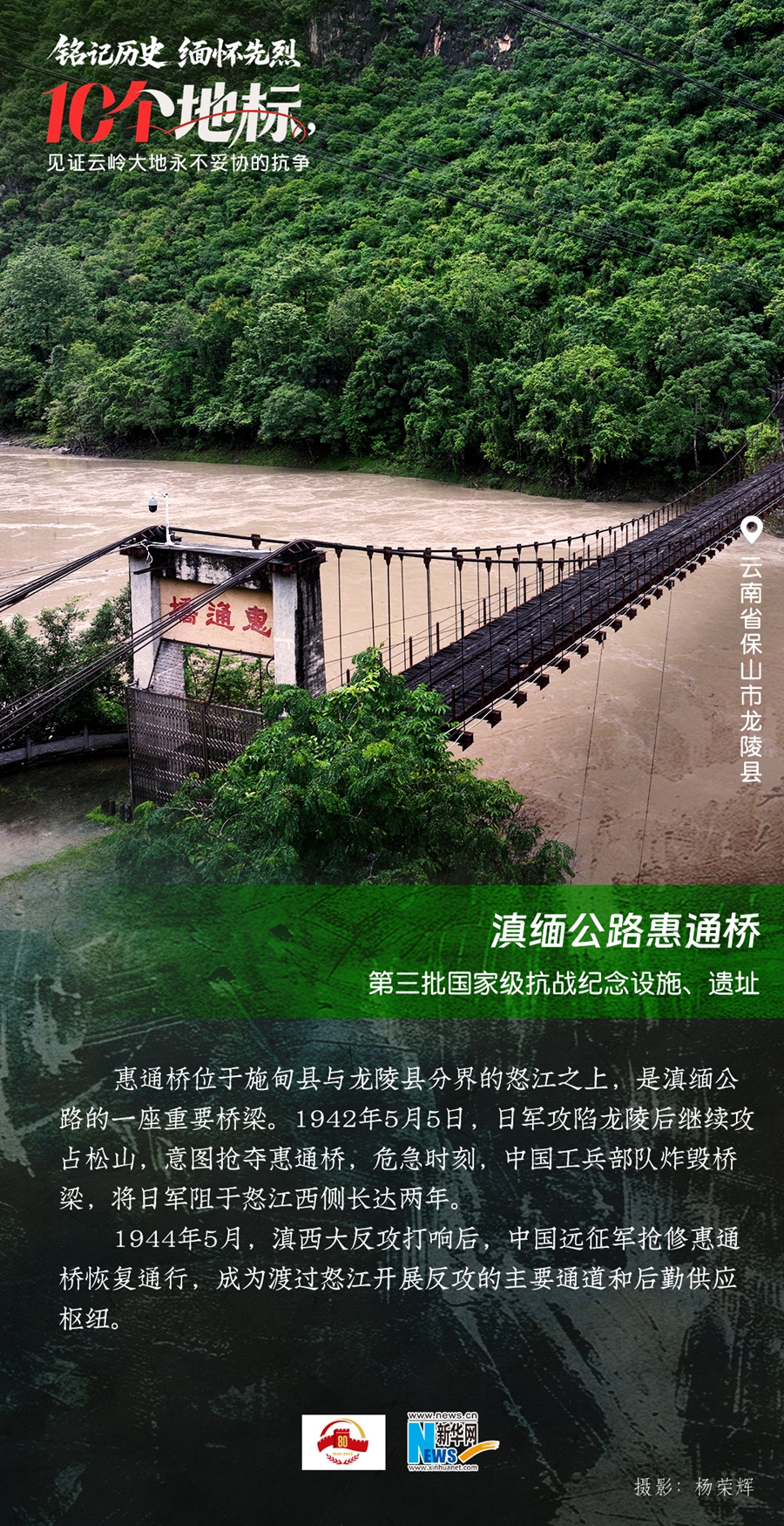 ??80年過(guò)去,曾經(jīng)的戰(zhàn)場(chǎng)硝煙雖散,但英氣永存。在國(guó)務(wù)院公布的前三批國(guó)家級(jí)抗戰(zhàn)紀(jì)念設(shè)施、遺址名錄中,云南省共有10個(gè),分別為騰沖國(guó)殤墓園、騰沖滇西抗戰(zhàn)紀(jì)念館,龍陵抗日戰(zhàn)爭(zhēng)紀(jì)念館,國(guó)立西南聯(lián)合大學(xué)舊址,抗戰(zhàn)勝利紀(jì)念堂,松山戰(zhàn)役舊址,南洋華僑機(jī)工回國(guó)抗日紀(jì)念碑,怒江駝峰航線(xiàn)紀(jì)念館,施甸縣抗日江防遺跡群,滇緬公路惠通橋,滇西抗日戰(zhàn)爭(zhēng)紀(jì)念碑。它們承載著國(guó)人共同的歷史記憶與民族情感,也為我們學(xué)習(xí)和傳承抗戰(zhàn)精神提供了現(xiàn)實(shí)條件。