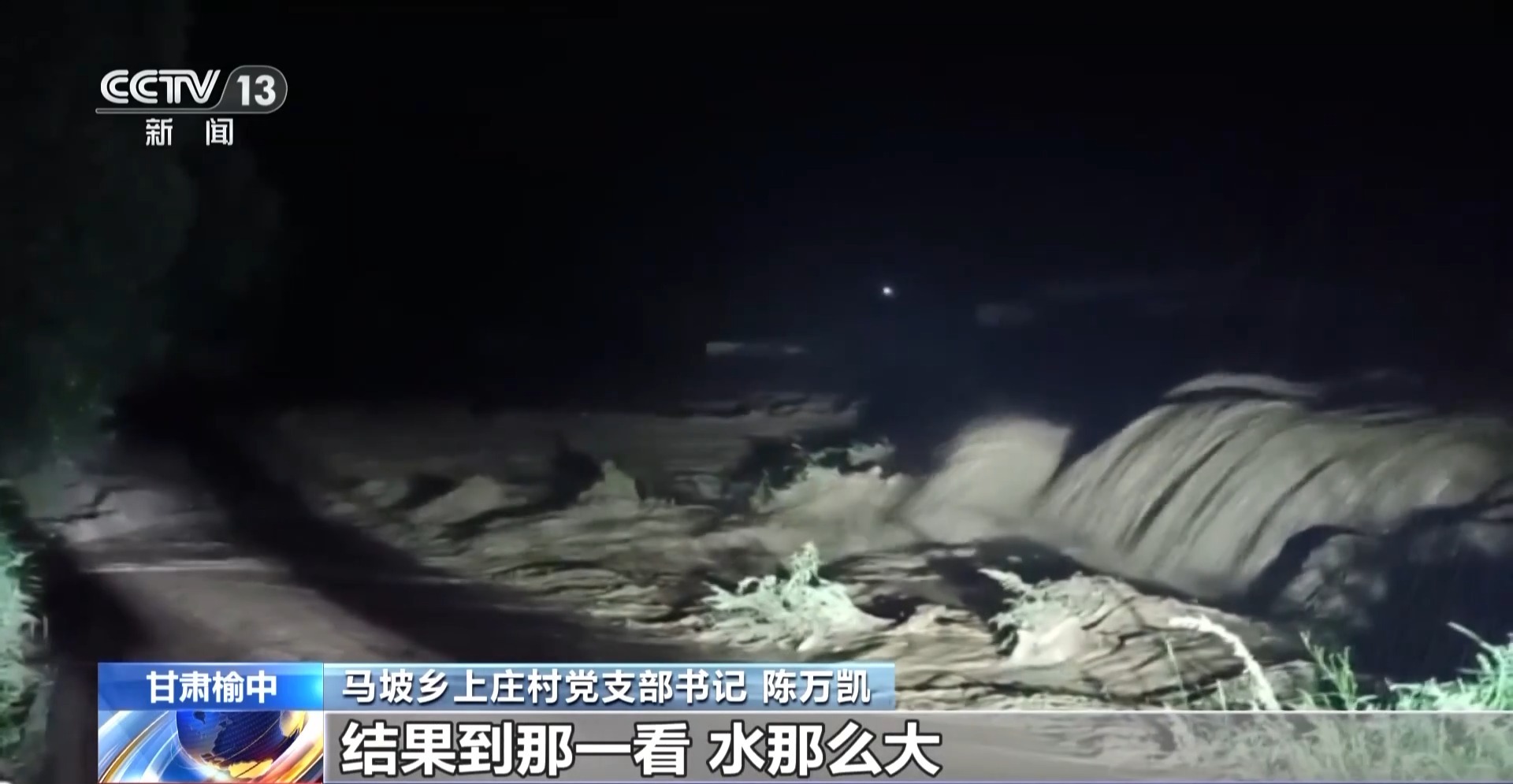 馬坡鄉(xiāng)上莊村黨支部書(shū)記 陳萬(wàn)凱:我是慌呀,慌得我就出來(lái)一直在這里轉(zhuǎn)著,轉(zhuǎn)著我就看見(jiàn)變壓器上冒開(kāi)火了,想看一下變壓器咋回事,結(jié)果到那一看,水那么大。