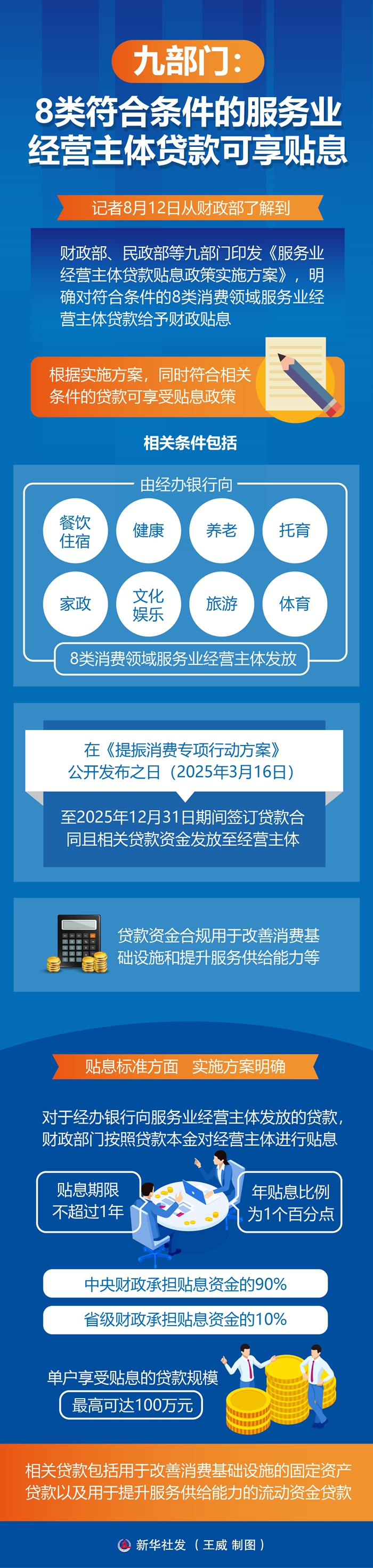 新華社北京8月12日電(記者申鋮)記者12日從財政部了解到,財政部、民政部等九部門印發(fā)《服務(wù)業(yè)經(jīng)營主體貸款貼息政策實施方案》,明確對符合條件的8類消費領(lǐng)域服務(wù)業(yè)經(jīng)營主體貸款給予財政貼息。