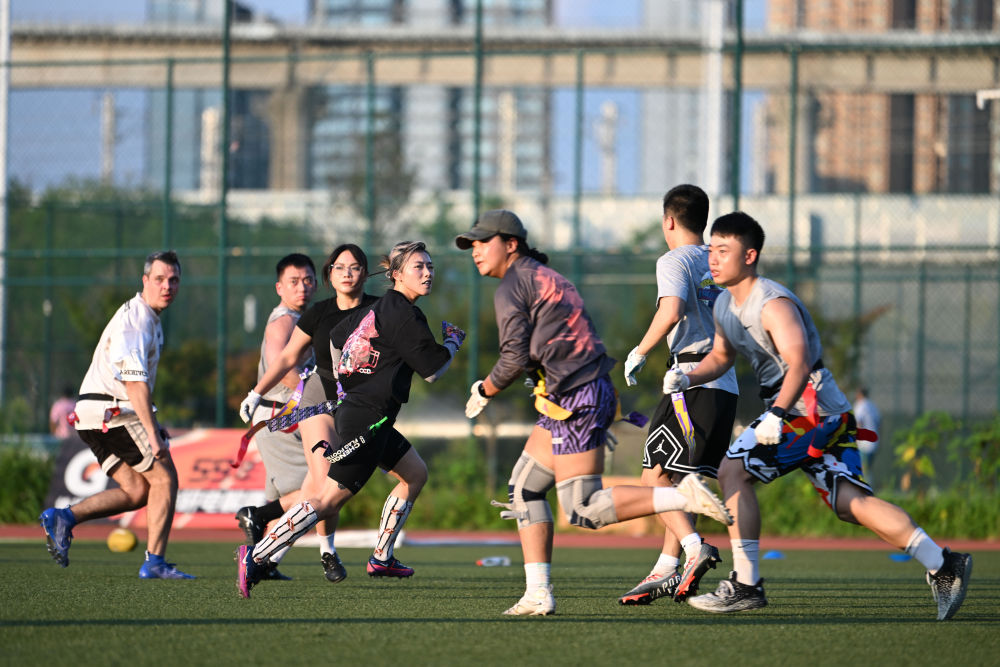7月27日,在成都工作生活的運(yùn)動(dòng)愛好者吳慶文(左四)在腰旗橄欖球比賽中。新華社記者 胥冰潔 攝