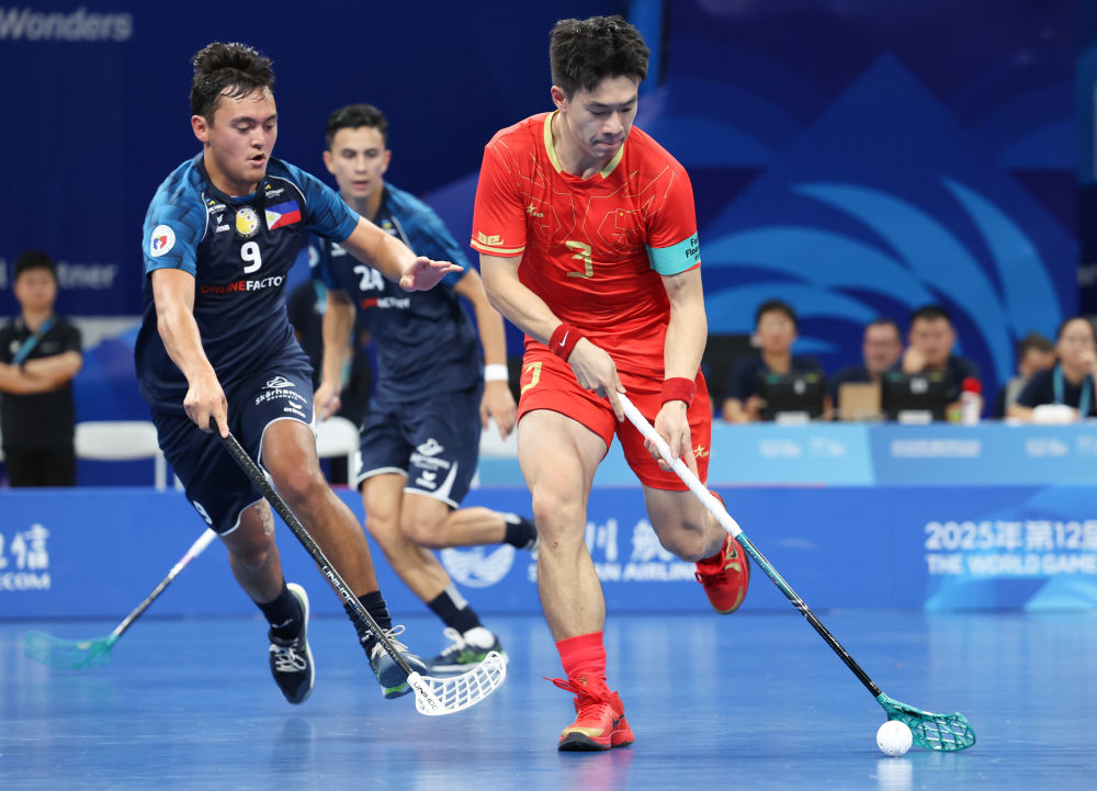 8月12日,中國(guó)隊(duì)球員杜三洋(右一)在軟式曲棍球男子第七名爭(zhēng)奪賽中帶球進(jìn)攻。新華社記者 梁旭 攝