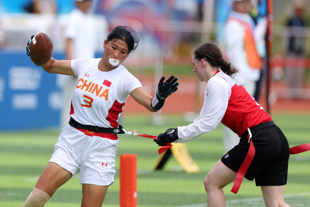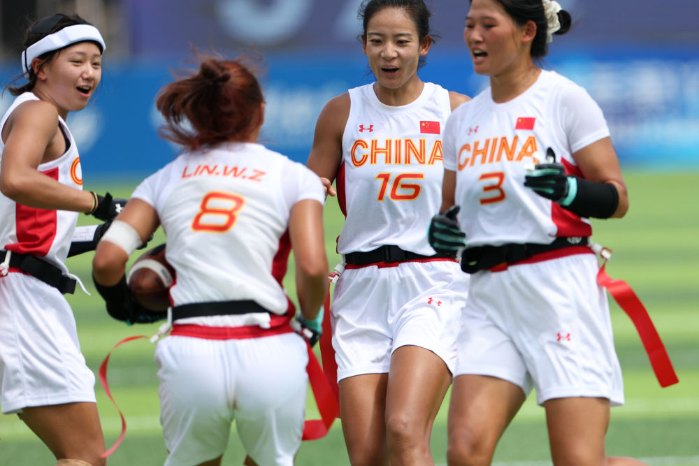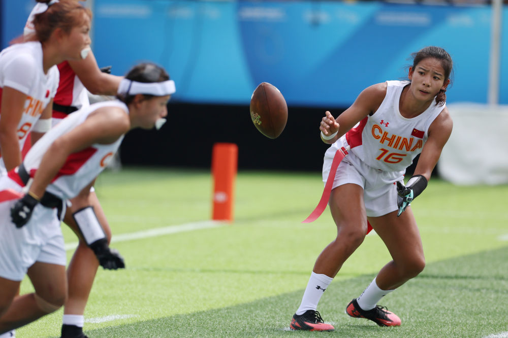 14日,腰旗橄欖球項(xiàng)目開(kāi)賽。賽場(chǎng)上的激烈比拼與觀眾席上的“雄起”吶喊讓體育場(chǎng)“燃”起來(lái)。