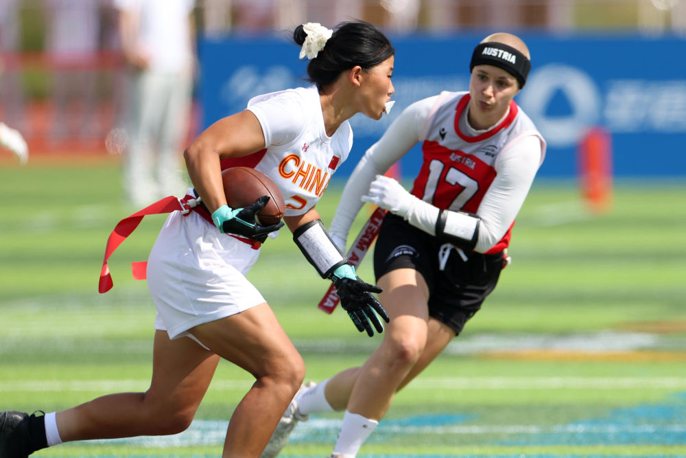 8月14日,在2025年成都世運(yùn)會(huì)腰旗橄欖球女子預(yù)賽A組比賽中,中國(guó)隊(duì)45:47不敵奧地利隊(duì)。圖為中國(guó)隊(duì)球員高子旋(左)在比賽中。新華社記者 陳斌 攝