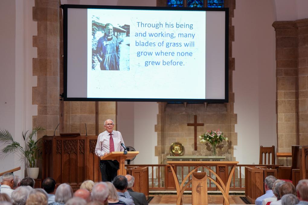 7月22日,在英國(guó)赫特福德郡哈彭登鎮(zhèn),喬治·艾爾溫·何克的外甥馬克·艾爾溫·托馬斯在紀(jì)念活動(dòng)上發(fā)表演講。新華社記者 吳魯 攝