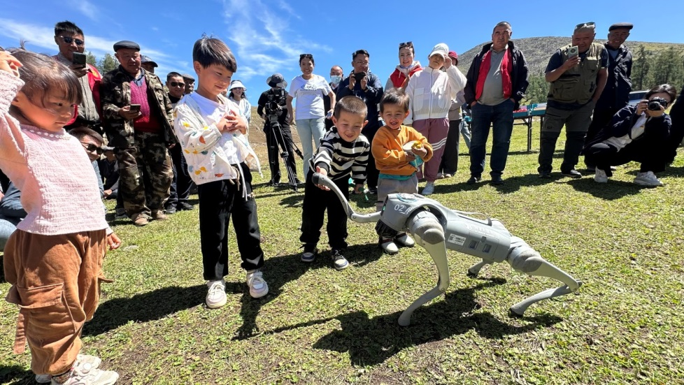科普大篷車開進(jìn)新疆阿勒泰青河縣套查干湖夏牧場,當(dāng)?shù)匦∨笥押蜋C(jī)器狗互動。(新疆科技館供圖)