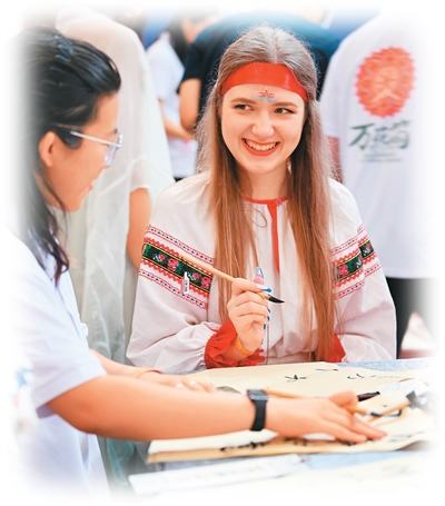 8月6日,“上合之約·絲路津彩”上合國家青年學生“萬花筒”文化市集在天津舉行。圖為青年學生體驗書法。