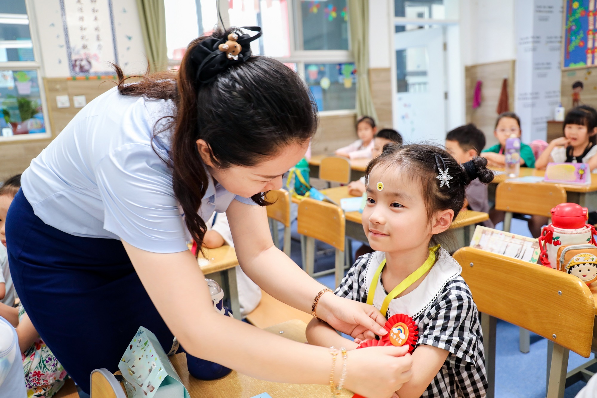 老師為新生帶上獎勵的“小勛章”(央廣網(wǎng)發(fā) 西安高新第八小學(xué)供圖)