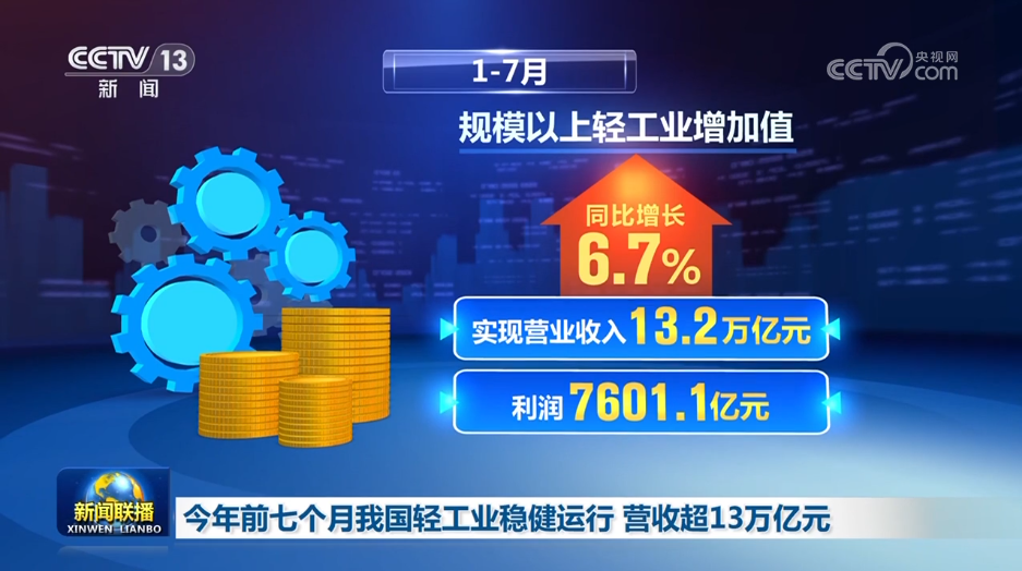中國輕工業(yè)聯(lián)合會數(shù)據(jù)顯示,今年前七個月,在擴內(nèi)需、促消費政策支持下,我國輕工業(yè)運行穩(wěn)健,生產(chǎn)、營收、市場規(guī)模均保持良好態(tài)勢。規(guī)模以上輕工業(yè)增加值同比增長6.7%,實現(xiàn)營業(yè)收入13.2萬億元、利潤7601.1億元。