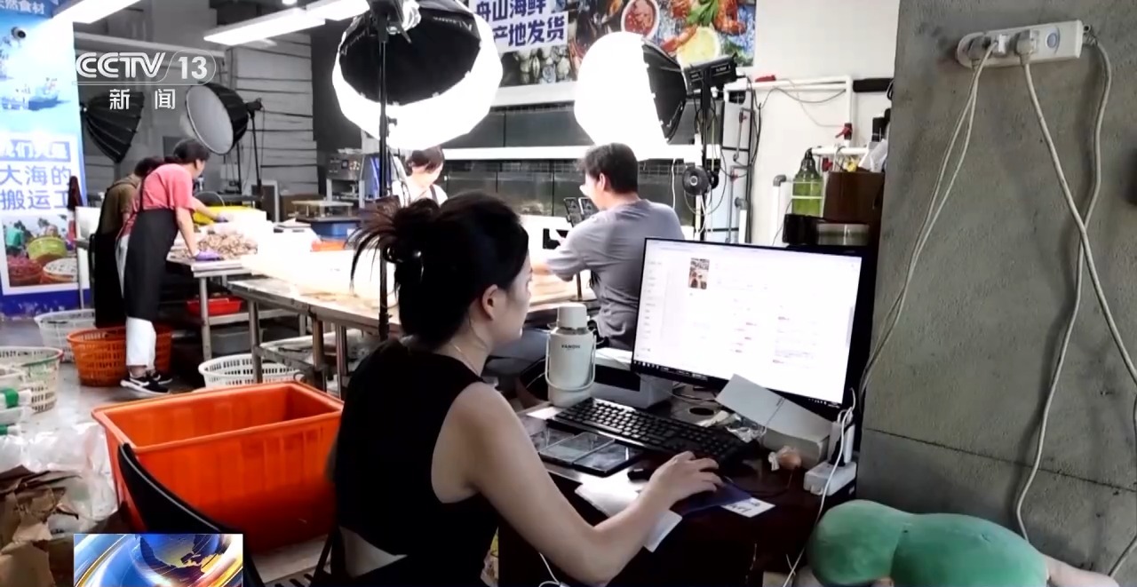 漁船忙著卸貨的同時(shí),在距離碼頭不遠(yuǎn)的電商產(chǎn)業(yè)園里,主播們正售賣新鮮上市的梭子蟹。為了縮短發(fā)貨時(shí)間,這家店鋪在直播的同時(shí)打包海鮮,即買即發(fā),每天可以發(fā)出六到七百個(gè)訂單。