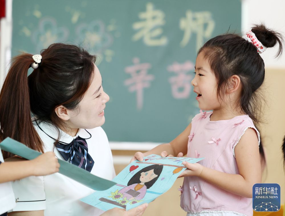 9月9日,山東省臨沂市郯城縣郯城街道官塘幼兒園的孩子將在老師的指導(dǎo)幫助下制作的繪畫送給老師。新華社發(fā)(張春雷攝)