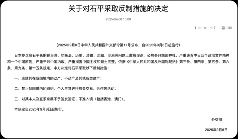 9月8日,中方宣布對日本參議員石平采取反制措施,禁止其進(jìn)入中國境內(nèi),凍結(jié)其在華資產(chǎn),并限制其與中國的商業(yè)往來。