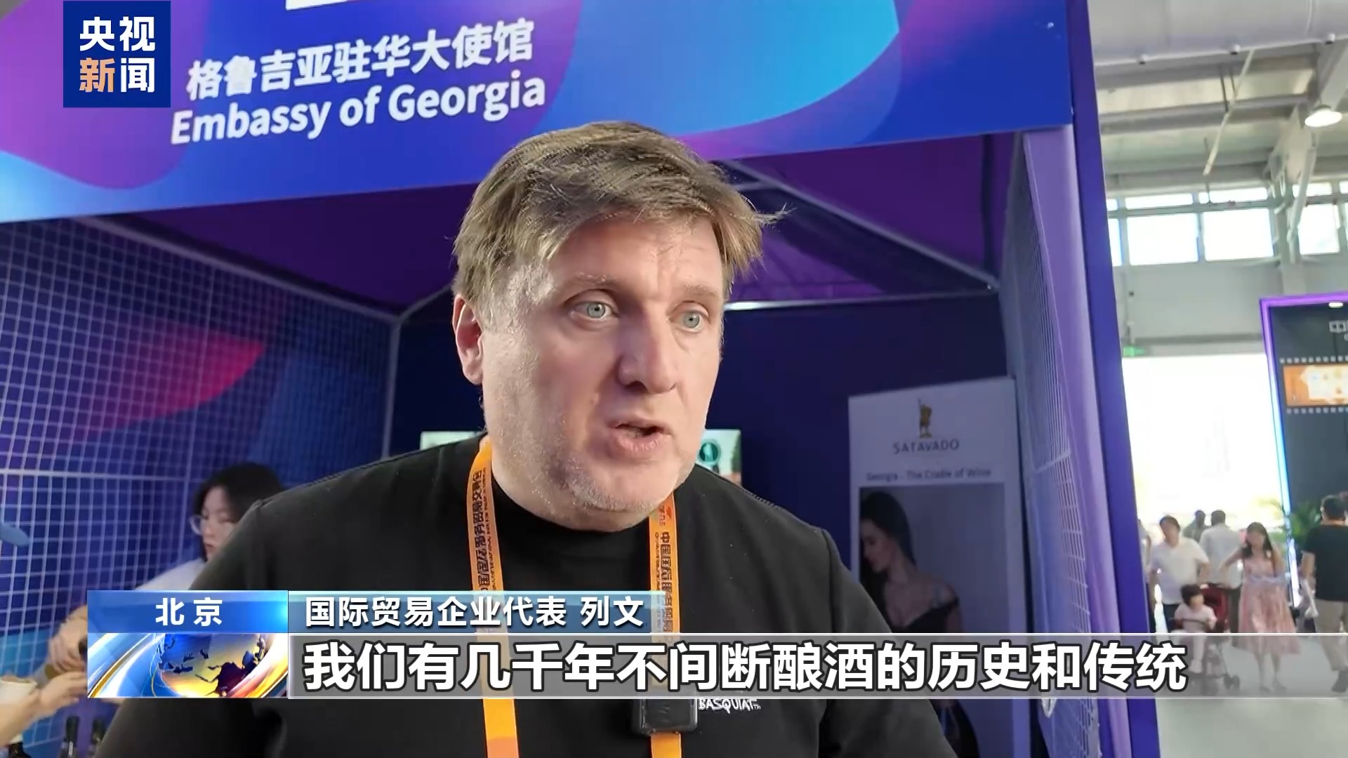 在格魯吉亞駐華大使館展臺(tái),國際貿(mào)易企業(yè)代表列文正在請觀眾品嘗格魯吉亞的特色葡萄酒。他說,他的公司已經(jīng)連續(xù)7年參加服貿(mào)會(huì)。