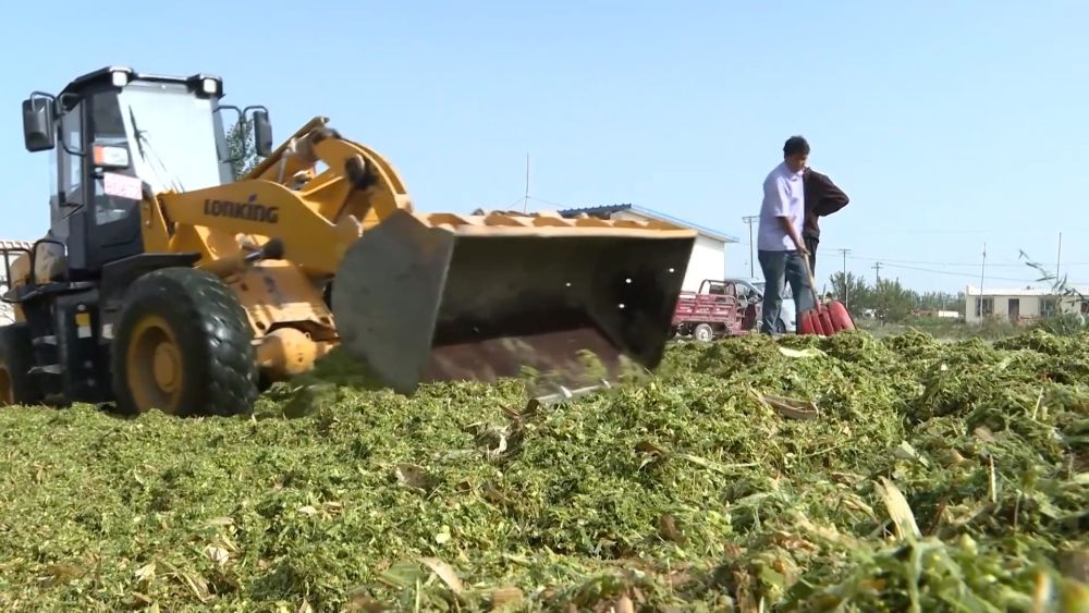 在焉耆縣永燁牛羊生態(tài)養(yǎng)殖專業(yè)合作社內(nèi),工作人員將新鮮采收的青貯玉米搬到青貯窖中壓實,為牲畜越冬提前備足“口糧”。